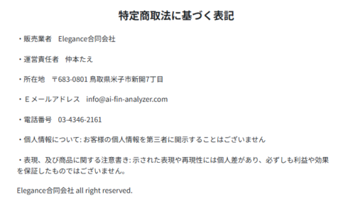 特定商取引法に基づく表記を確認すると、運営元は「Elegance合同会社」となっていますが、その登記住所は「鳥取県」です。