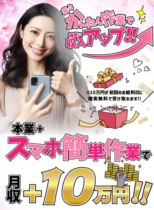 「スマホ一台で月5万円」や「初回15万円プレゼント」という魅力的な言葉で誘う「楽々かんたん作業で確実に収入アップ」。